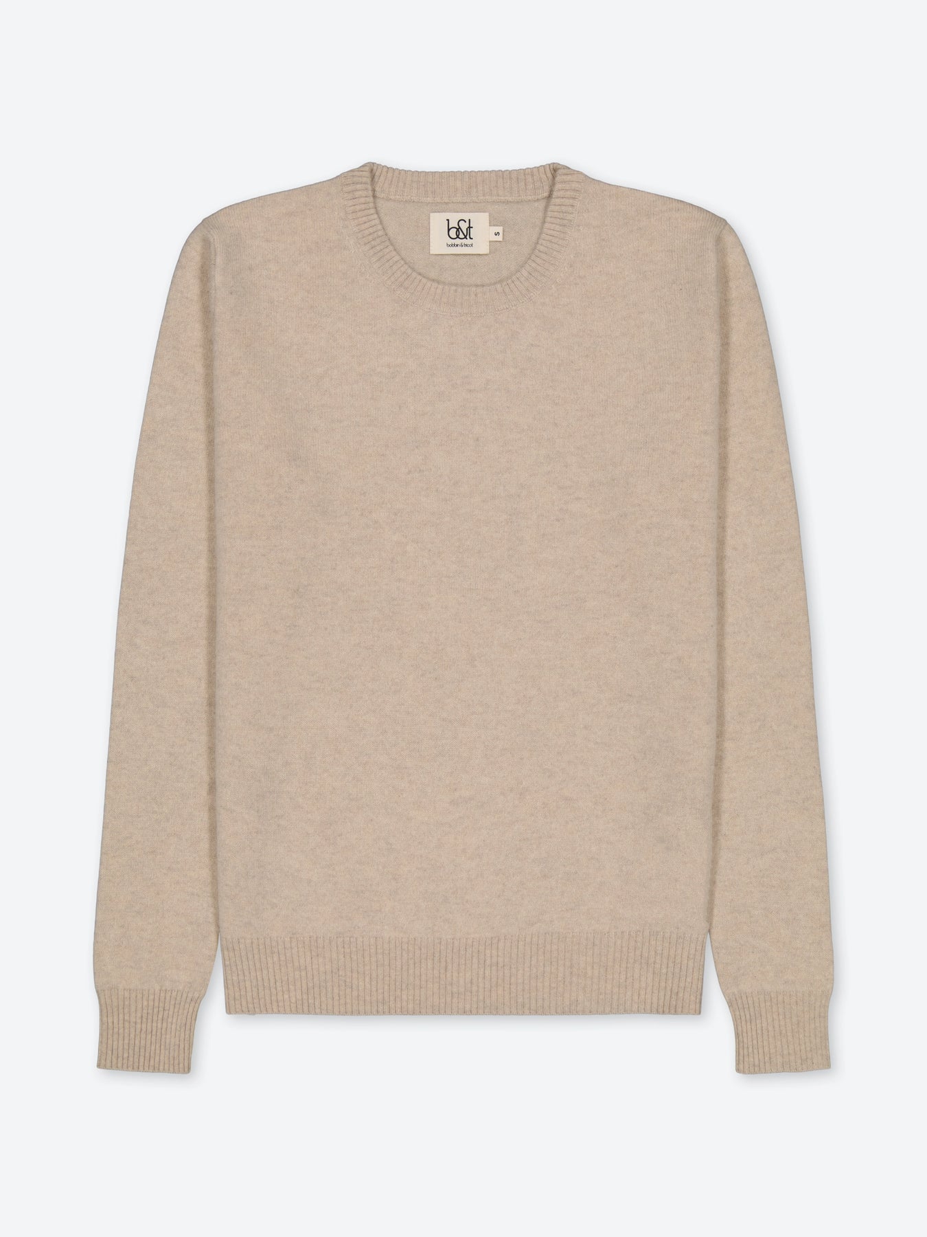 Pull classique col rond tricoté en cachemire régénéré. Pour les femmes et les hommes, c'est un essentiel en toute saison.