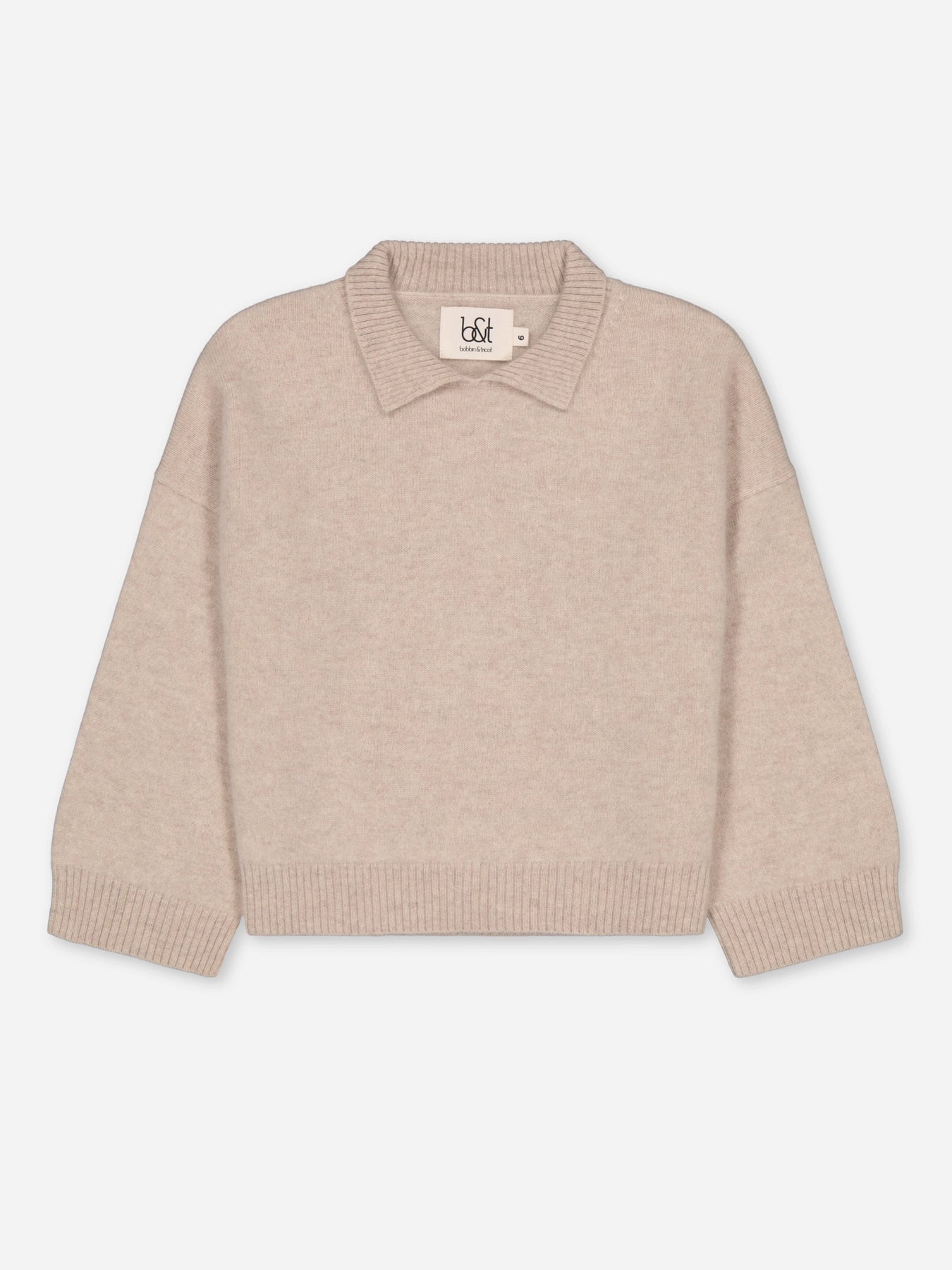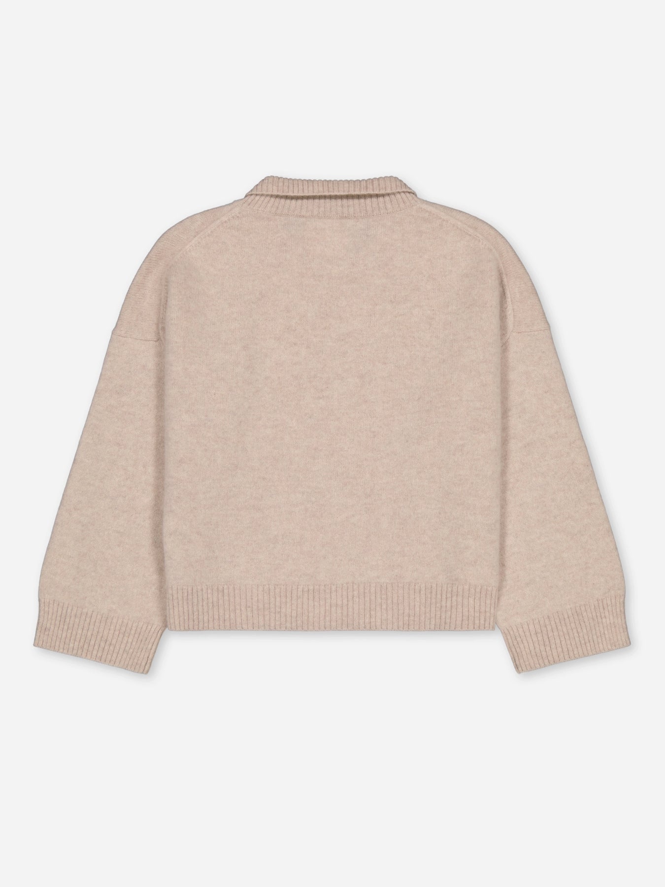 Regular price €145.00Polo sweater, boxy shape and wide sleeves, knitted in regenerated cashmere. All season and unisex. Children and teenager sizes.